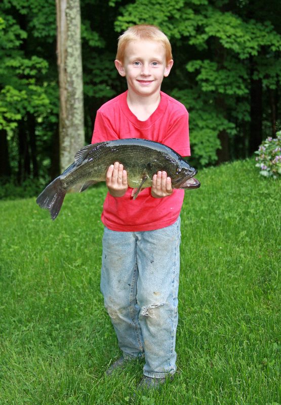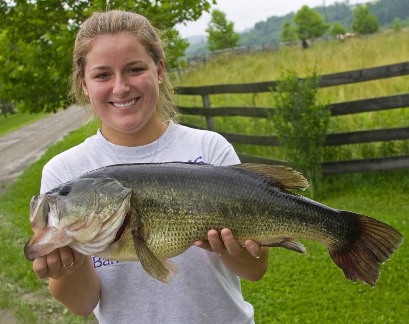 Chris Hunter with a bass captured at Dickinson Cattle Co Saturday morning at 9:30. | Gary Eller with his huge bass caught in the Virginia pond, Dickinson Cattle Co, Barnesville, Ohio. |
